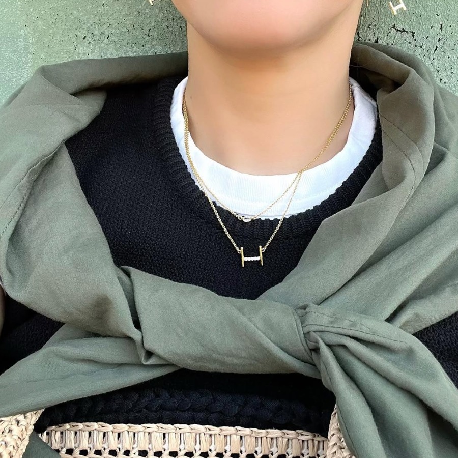 上段にはラグビーボールに見立てた小さな楕円形のジルコニアを配置し、透明感のある優しい輝きが胸元を明るく見せてくれます。下段のHポールのクロスバー部分にも細かなジルコニアを敷き詰め、繊細ながらもキラキラとした存在感を放ち、視線を自然と引き寄せるポイントになっています。