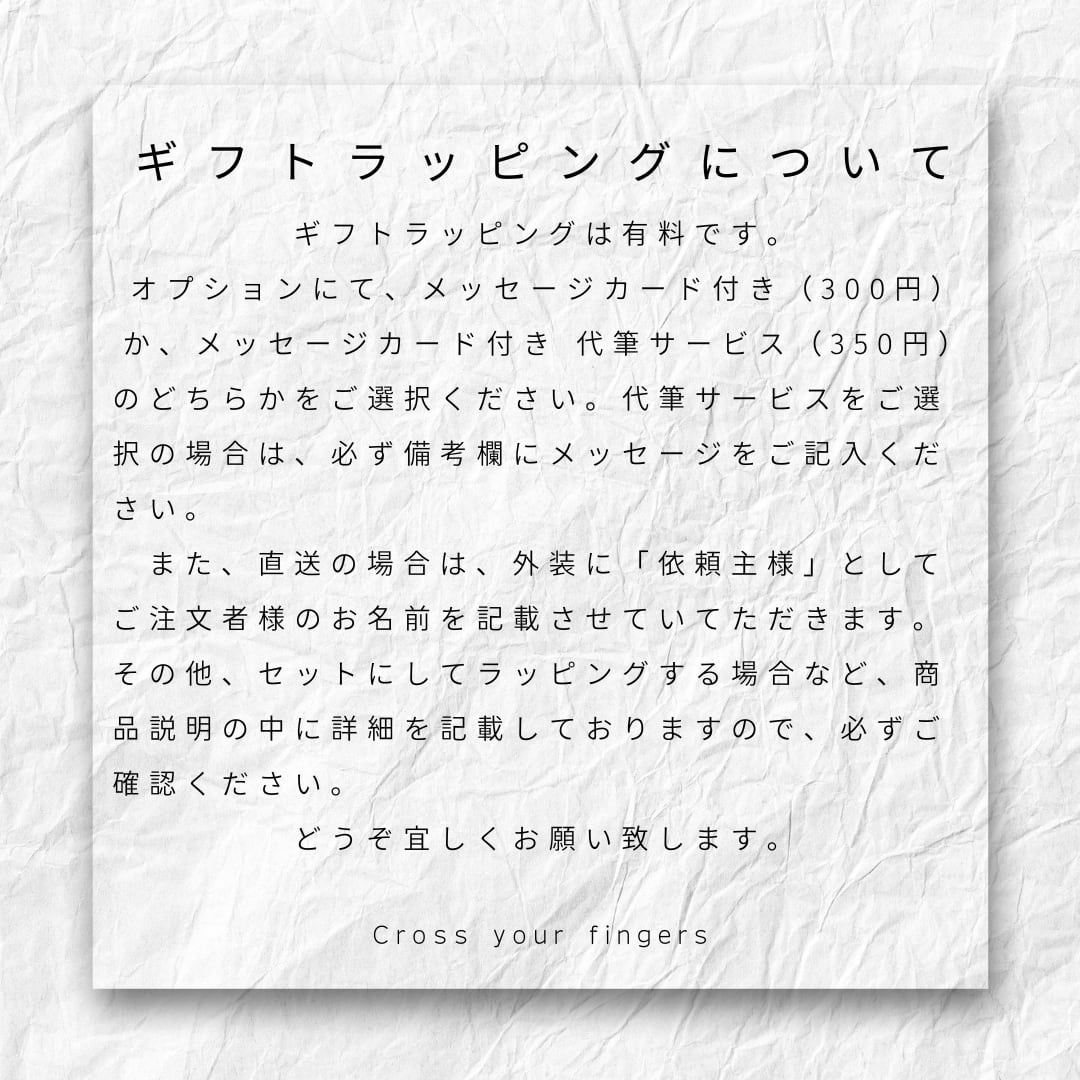 他のアイテムとセットでラッピングをご希望の場合は、どちらかの商品ページのオプションでラッピングをご選択ください。備考欄にセットにするアイテムをご記入ください。ご記入がない場合は、オプションをご選択いただいたページの商品のみラッピングさせていただきます。