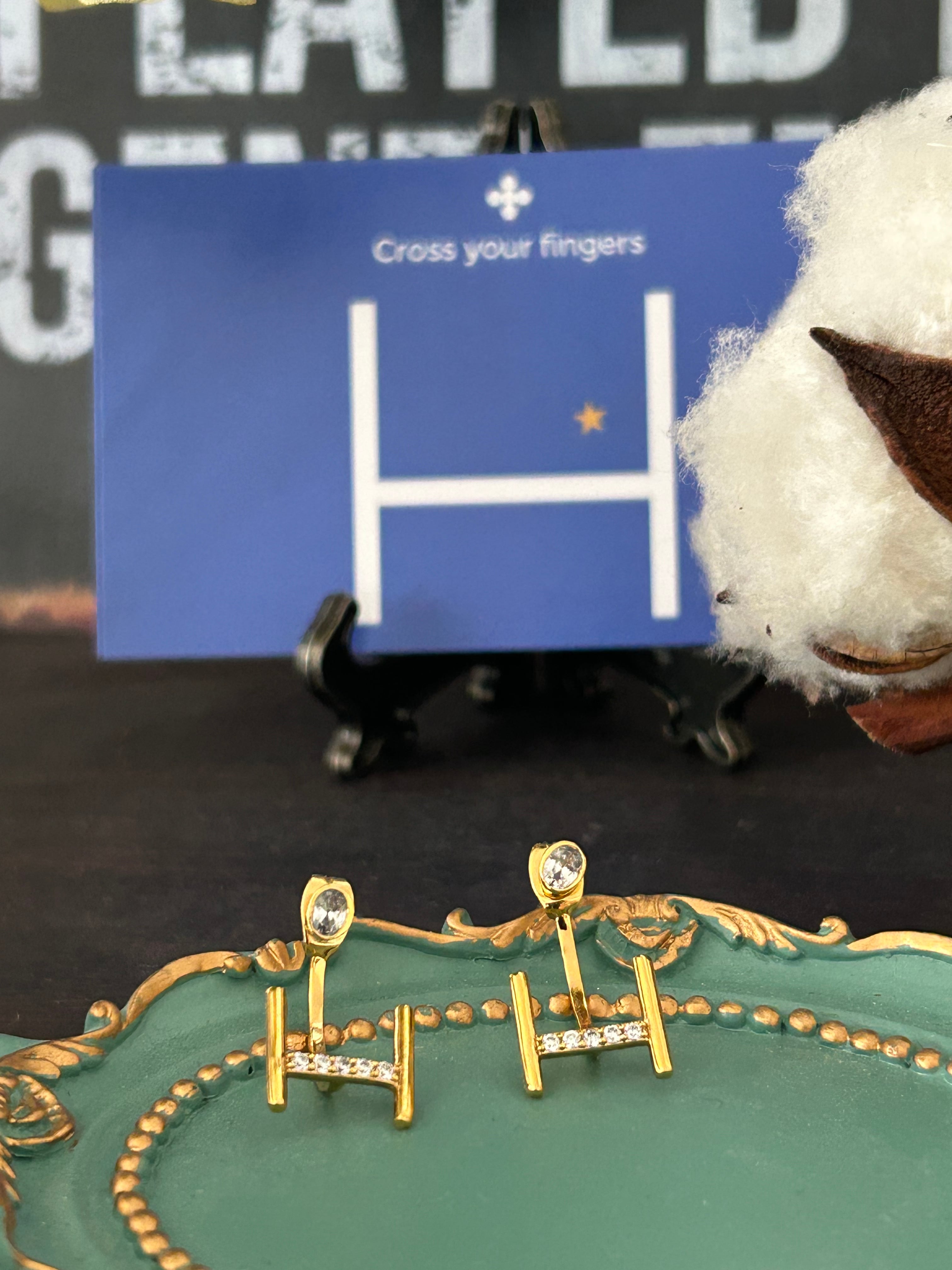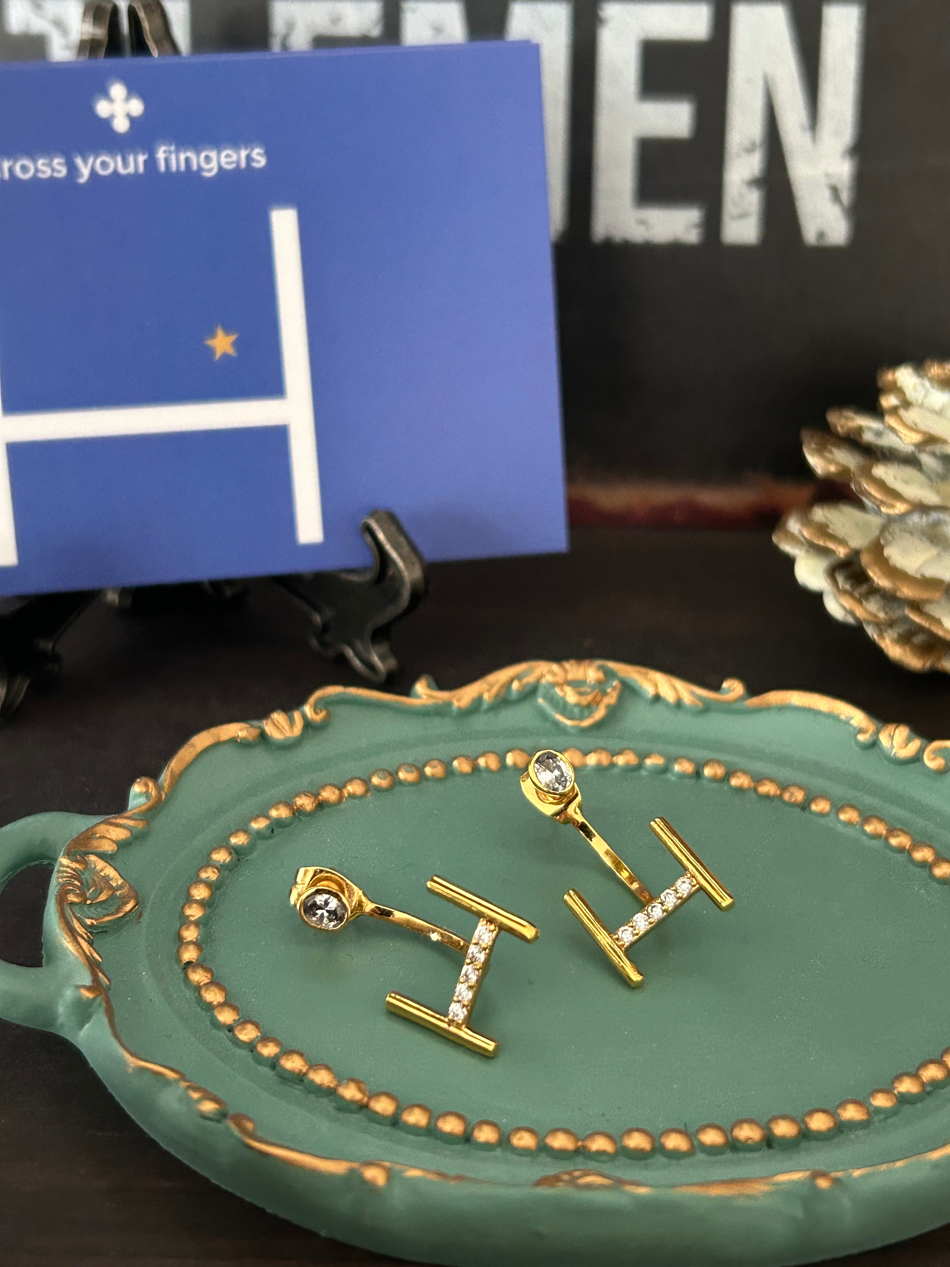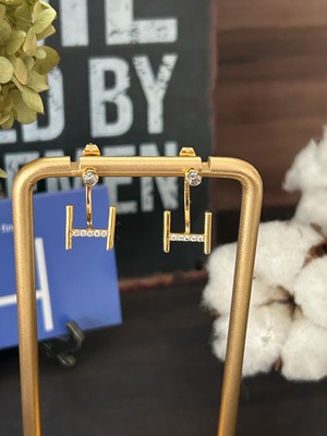 ネックレスやブレスレットで完成した「2連のデザイン」を、ピアスというアイテムに合わせて再構築したのがこちらのピアスです。ポスト側にはラグビーボールに見立てた一粒の楕円ジルコニアをセットし、キャッチ側にはHポールのデザインを配置。耳に装着すると、まるで本当にボールがHポールを通過していくかのように見えるユニークで洗練された構造になっています。